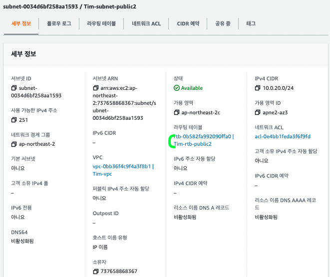서브넷에서 라우팅 테이블 rtb를 클릭하면 라우팅 테이블로 이동하게되고, Tim subnet public 2 도 인터넷으로 향하는 경로가 생성되었습니다. 한마디로 현재 생성 된 Tim-subnet-public1, 2 의 라우팅 테이블은 Tim-rtb-public2 를 바라보고 있습니다