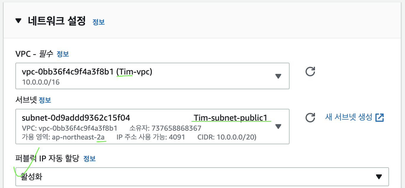 퍼블릭 IP 자동 할당을 활성화로 변경해주시고, 전에 만들었던 VPC 와 서브넷을 등록합니다.