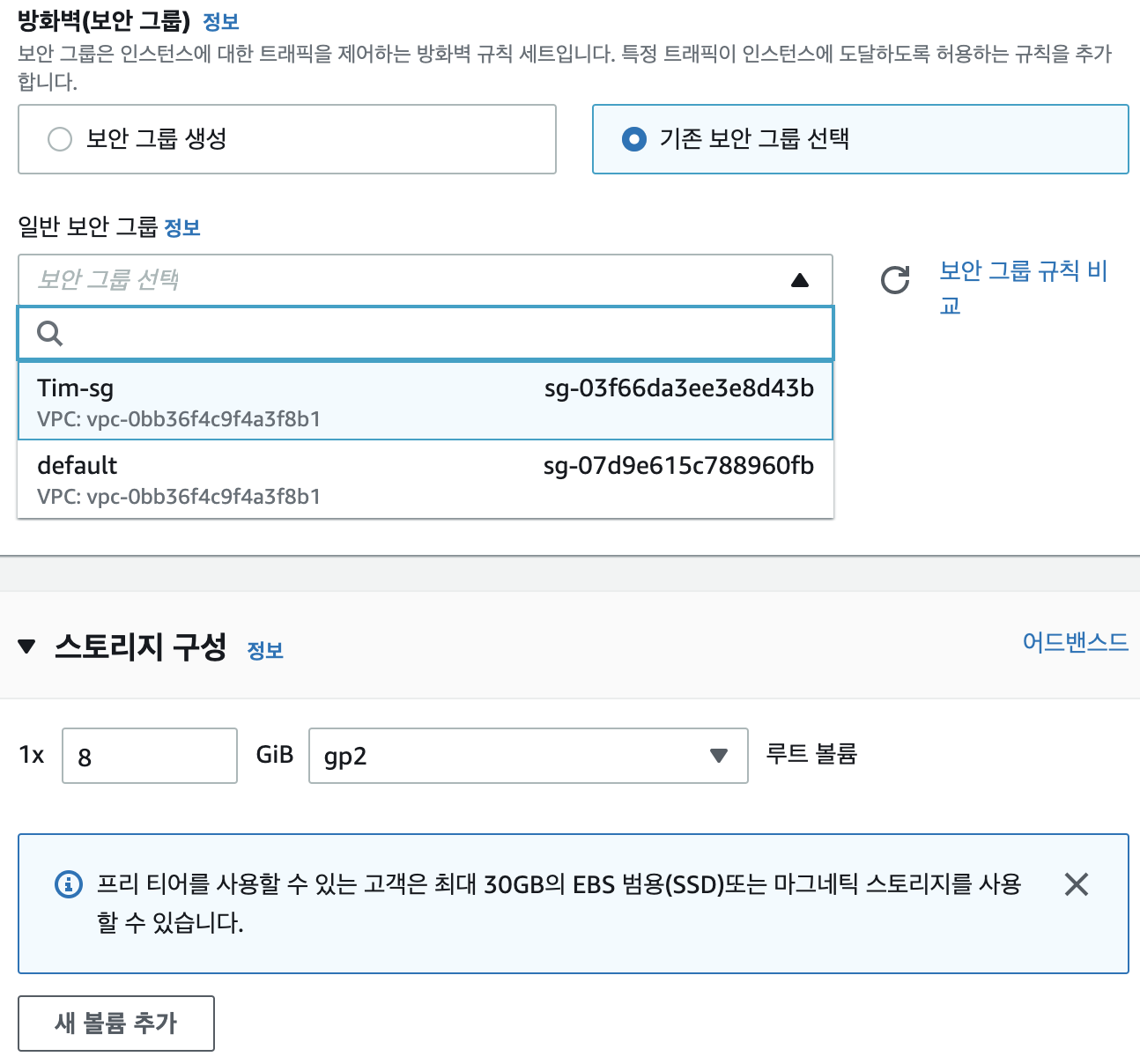다음으로 VPC 생성할 때 만들었던 Security Grou을 설정해주시고, 스토리지는 기본으로 두겠습니다.