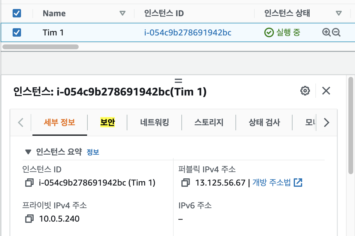 현재는 한 개의 EC2를 생성하였고, 서브넷도 Tim-subnet-public1을 사용하였습니다.