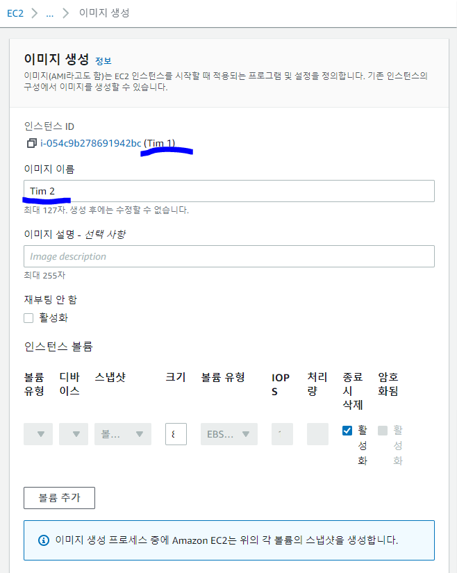 이미지 이름을 입력하고, 맨 아래있는 '이미지 생성'을 클릭합니다.