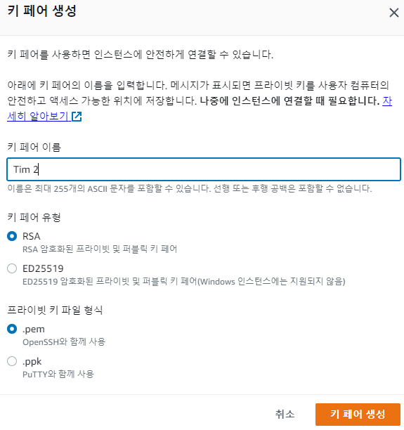 키 페어(로그인) 한 마디로 인스턴스를 연결 할 때 키 페어를 사용하여 안전하게 연결 할 수 있습니다.
