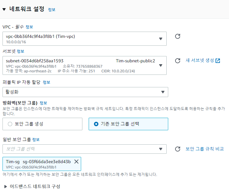 지금 떠 있는 EC2 는 -2a 를 바라보고 있기 때문에 AMI 으로 새로 만드는 것은 -2c로 설정하겠습니다. 또 퍼블릭 IP 자동 할당은 비활성화로 설정되어 있는 활성화로 변경해야 합니다. 마지막으로 '방화벽(보안그룹)' 은 기존 보안 그룹 선택을 해서 생성한 'Tim-sg' 를 선택합니다.