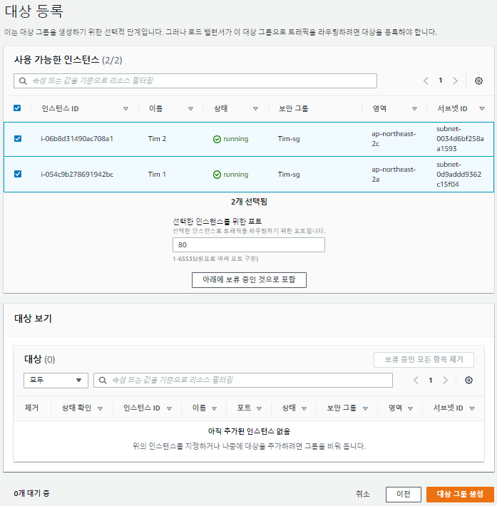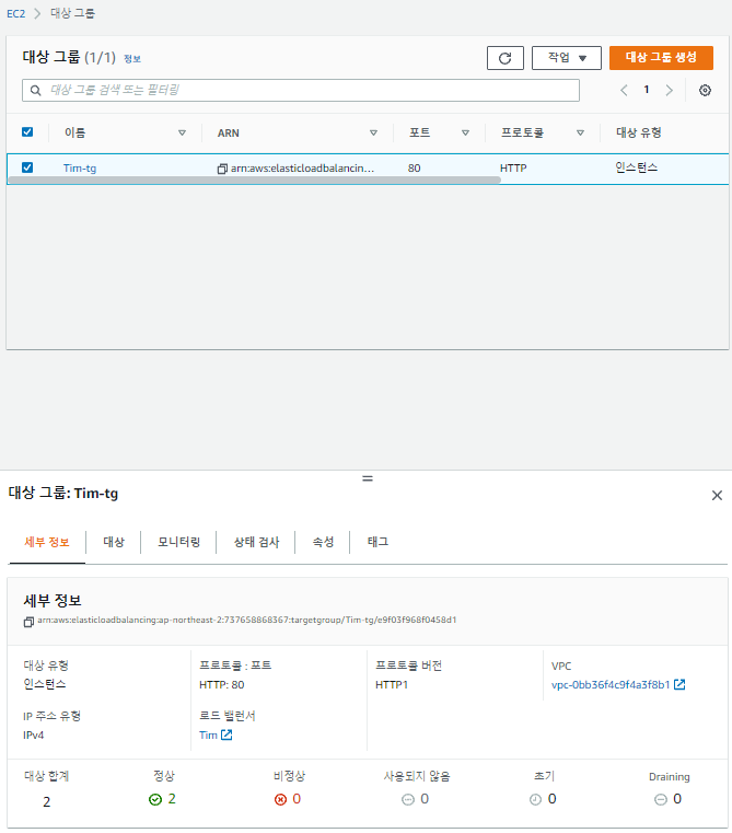 마지막으로 '대상 그룹' 으로 이동해서 로드밸런서 대상 상태를 확인할 수 있습니다.