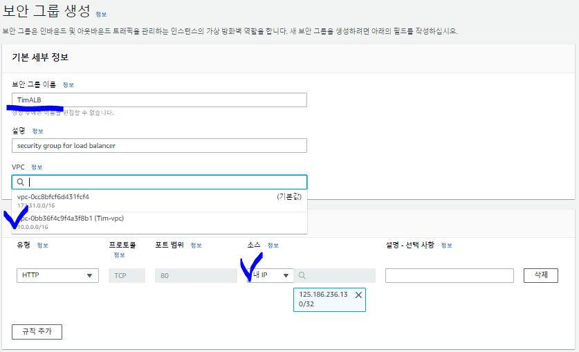 보안그룹을 생성해줍니다. 그리고, 다시 ALB 로 돌아와서 새로고침을 누르고, 새롭게 추가된 TimALB를 추가합니다.