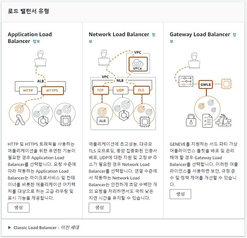 저희는 HTTP, HTTPS 트래픽을 사용하는 애플리케이션을 유연하게 사용하기 위해 Application Load Balancer를 선택하겠습니다.