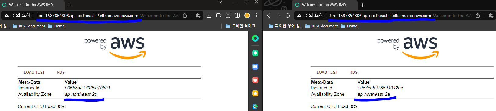 DNS 이름으로 접속해보면 '로드 밸런서'가 동작하면서 -2a, -2c 로 이동하는 것을 확인할 수 있습니다.