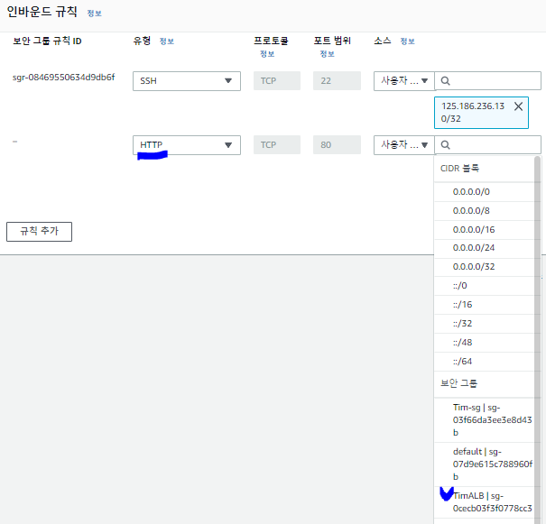 EC2의 보안그룹 80번 포트를 삭제한 이유는 ALB(로드밸런서)를 통한 트래픽만 받을 수 있으므로 새롭게 HTTP 유형을 생성하고, 아래 사진에서 표시해둔 보안그룹을 TimALB로 선택합니다.