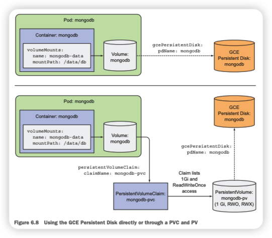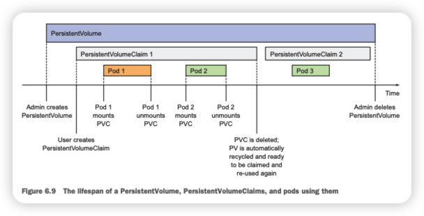 파드가 재스케줄링되더라도 동일한 퍼시스턴트볼륨클레임이 사용 가능한 상태로 유지되기를 원하므로 퍼시스턴트볼륨에 대한 클레임은 파드를 생성하는 것과 별개의 프로세스다.