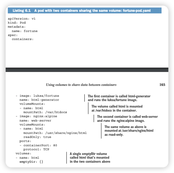 위 예제의 두 볼륨은 빈 상태로 초기화되므로 emptyDir 유형의 볼륨을 사용할 수 있다.
