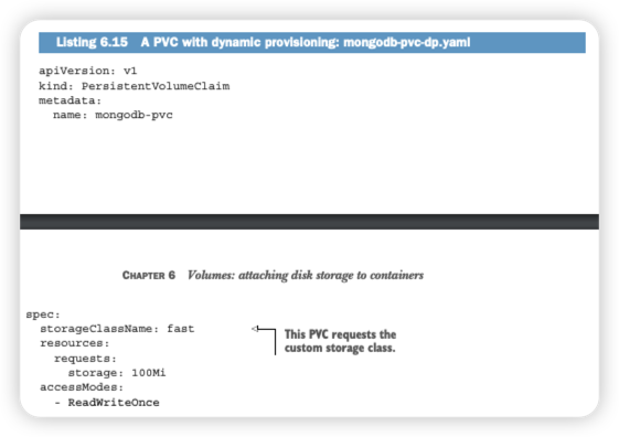 관리자가 많은 퍼시스턴트볼륨을 미리 프로비저닝하는 대신 하나 혹은 그 이상의 스토리지클래스를 정의하면 시스템은 누군가 퍼시스턴트볼륨클레임을 통해 요청 시 새로운 퍼시스턴트볼륨을 생성한다. 가장 큰 장점은 퍼시스턴트볼륨이 부족할 일이 없다는 것이다. (물론, 스토리지 용량이 부족할 수 있다.)