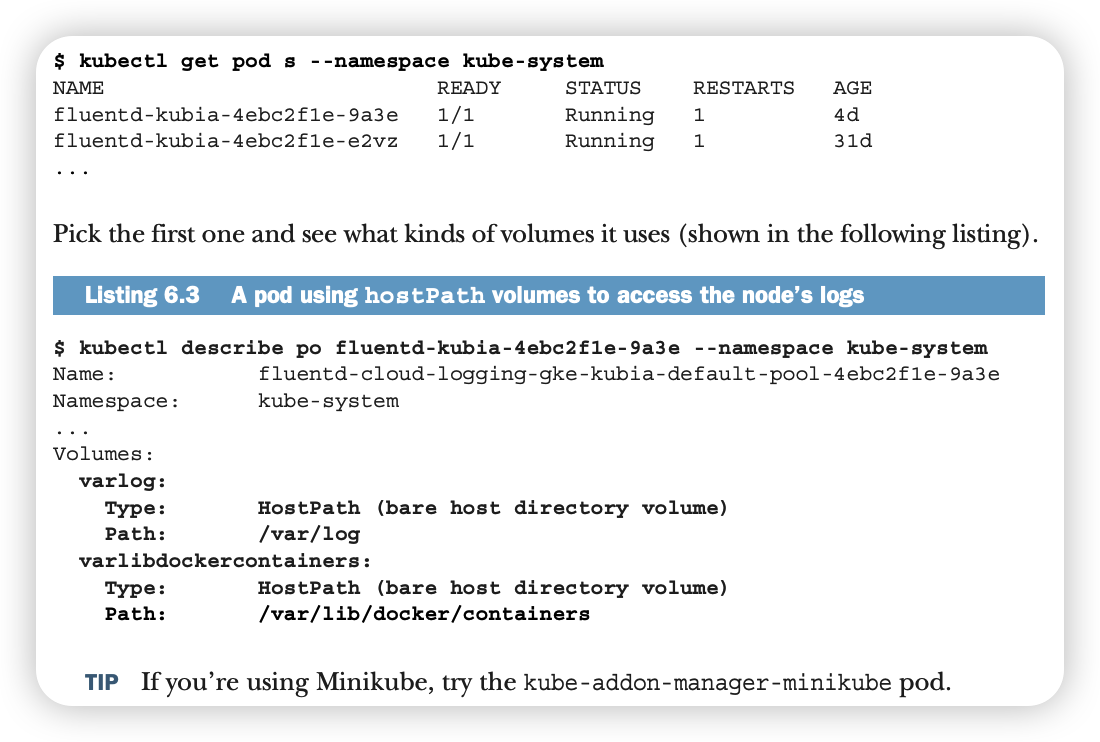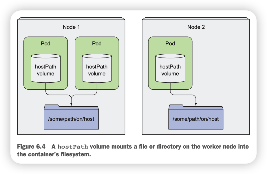 다른 파드를 검사해보면 그 중 어느 것도 hostPath 볼륨을 자체 데이터를 저장하기 위한 목적으로 사용하지는 않는다는 것을 볼 수 있다. ‘단지 노드 데이터에 접근하기 위해 사용한다.’ LET ME) 보통 로그저장 이나 디렉터리 볼륨