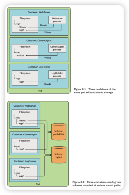 파드는 내부에 프로세스가 실행되고 CPU, RAM, 네트워크 인터페이스 등의 리소스를 공유하는 논리적 호스트와 유사하다고 했다. 프로세스가 디스크 또한 공유할 수 있을 것이라 예상하겠지만 사실은 그렇지 않다. 파드 내부의 각 컨테이너는 고유하게 분리된 파일시스템을 가진다 파일시스템은 컨테이너 이미지에서 제공되기 때문이다.