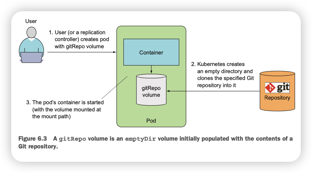 gitRepo 볼륨은 기본적으로 emptyDir 볼륨이며 파드가 시작되면 깃 리포지터리를 복제하고 특정 리비전을 체크아웃해 데이터로 채운다.
