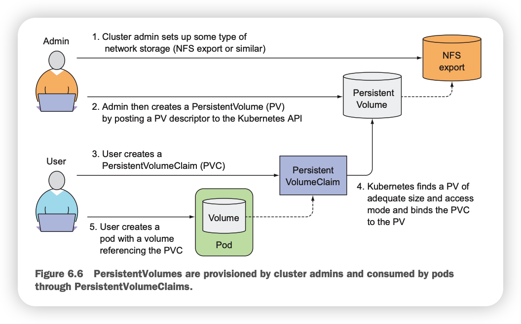 클러스터 관리자가 퍼시스턴트볼륨을 프로비저닝하면 파드는 퍼시스턴트볼륨클레임을 통해 이를 사용한다.