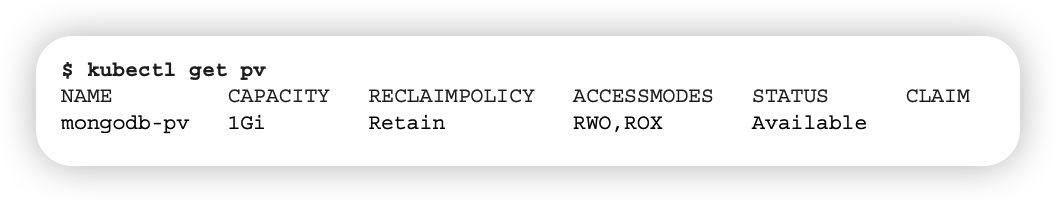 아직 퍼시스턴트볼륨클레임을 생성하지 않았으므로 퍼시스턴트볼륨이 Available로 표시