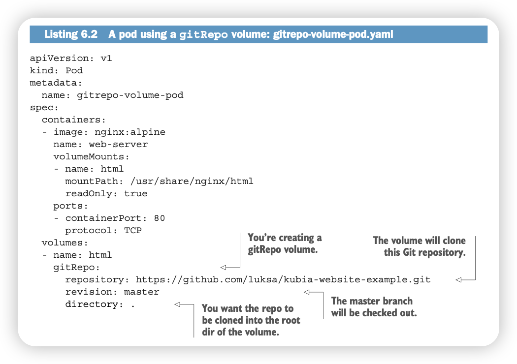 - gitRepo 볼륨을 사용해 파드의 시작 시점에 깃 리포지터리의 콘텐츠로 디렉터리를 쉽게 채운다.