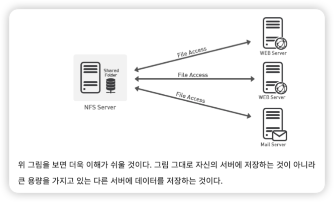 LET ME) ‘NFS란 네트워크 상에서 다른 컴퓨터의 파일 시스템을 마운트해서 공유하는 것이다.’ 즉, 다른 컴퓨터의 파일 시스템을 마치 자기 것 처럼 사용할 수 있는 것이다.