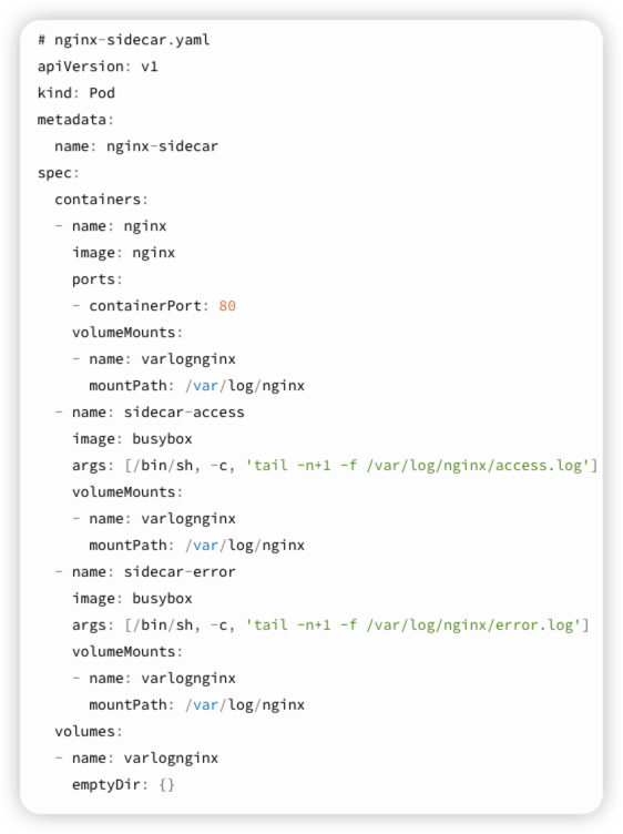 깃 동기화 프로세스가 Nginx 웹 서버와 동일 컨테이너에서 실행되면 안 되며 두 번째 컨테이너인 사이드카 컨테이너에서 실행돼야 한다. 사이드카 컨테이너는 파드의 주 컨테이너의 동작을 보완한다. 새로운 로직을 메인 애플리케이션 코드에 밀어 넣어 복잡성을 더하고 재사용성을 떨어뜨리는 대신에 파드에 사이드카를 추가하면 기존 컨테이너 이미지를 사용할 수 있다.
