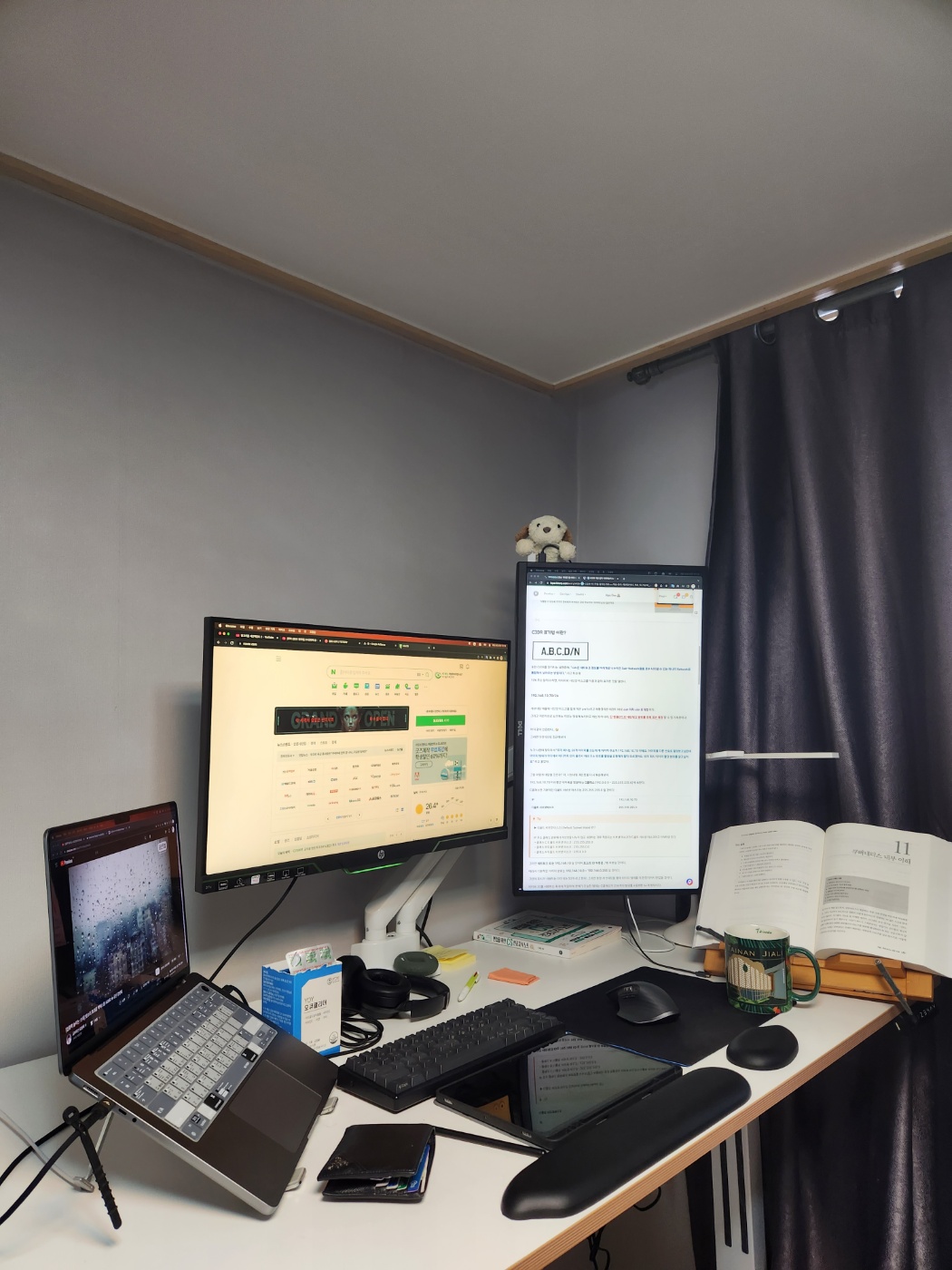 1400 핏쳐 모션데스크로 <노트북, 모니터1, 모니터2> 설치 했음에도 공간이 충분한 것을 볼 수 있습니다.