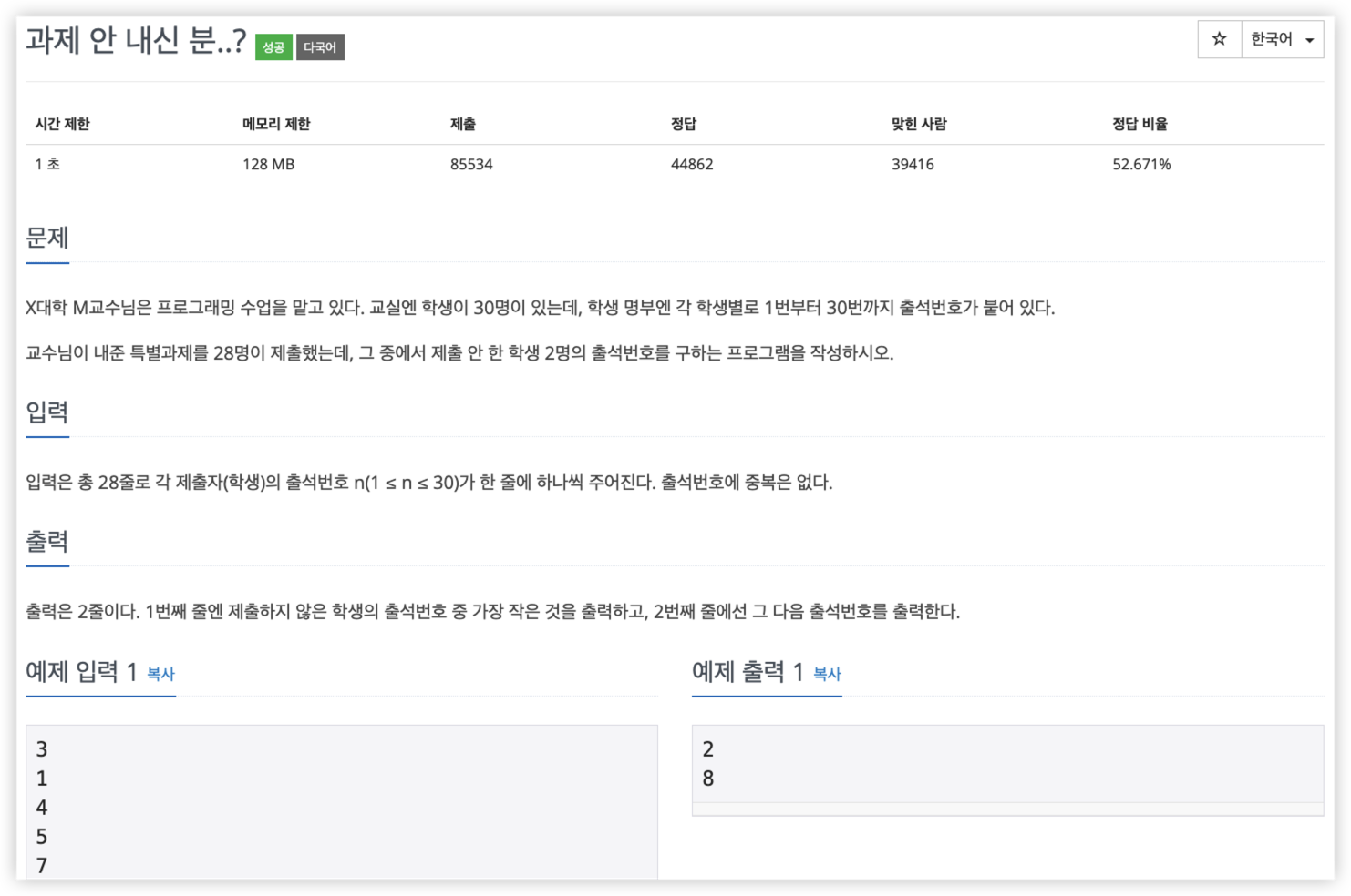 X대학 M교수님은 프로그래밍 수업을 맡고 있다. 교실엔 학생이 30명이 있는데, 학생 명부엔 각 학생별로 1번부터 30번까지 출석번호가 붙어 있다. 교수님이 내준 특별과제를 28명이 제출했는데,