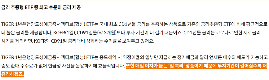 - 수수료가 0.05%로 경쟁 대상인 TIGER CD금리투자KIS(합성)과 같은 상품보다 비쌉니다.