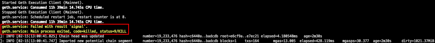 ethereum geth code=killed, status=9/KILL