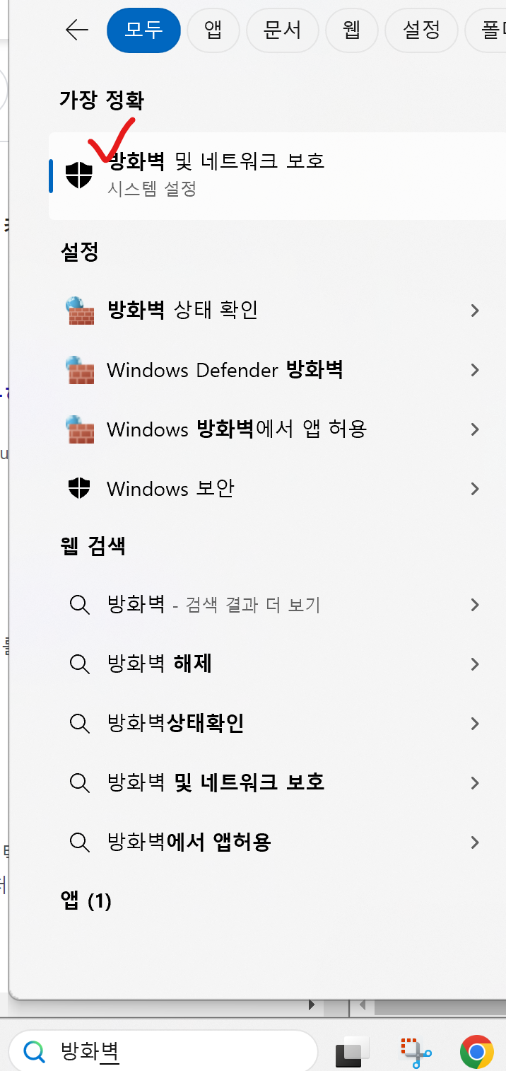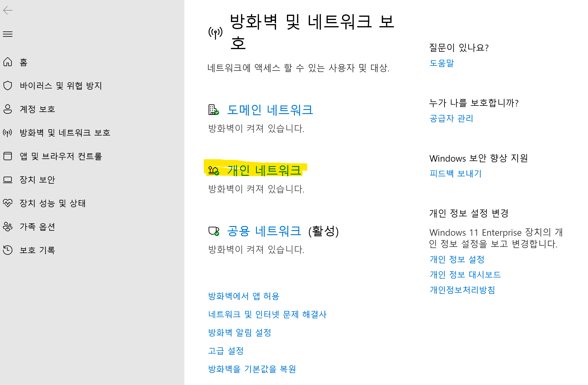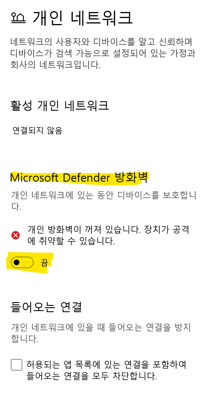 '개인 네트워크' 를 클릭하면 'Microsoft Defender 방화벽' 이 '켬' 으로 되어 있는 걸