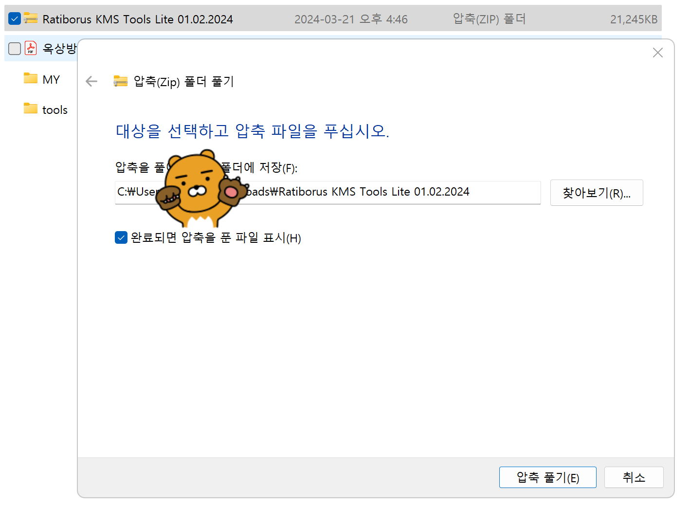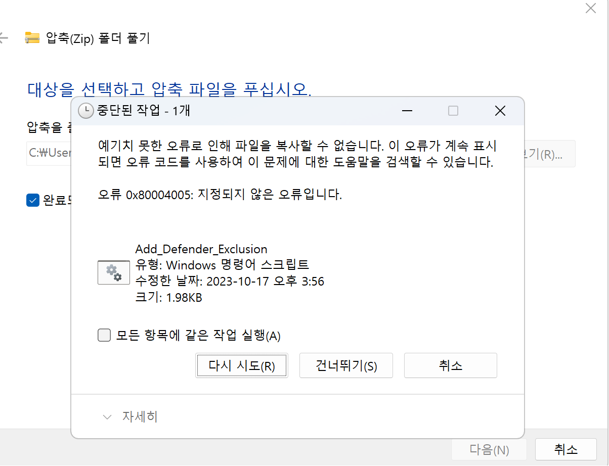 '압축 풀기' 아래와 같은 메시지가 보인다면 작업