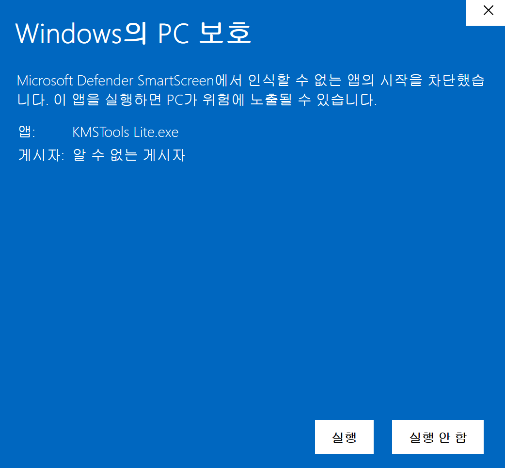 'Windows의 보호' 도 패스하고 실행 버튼을 누르겠습니다.