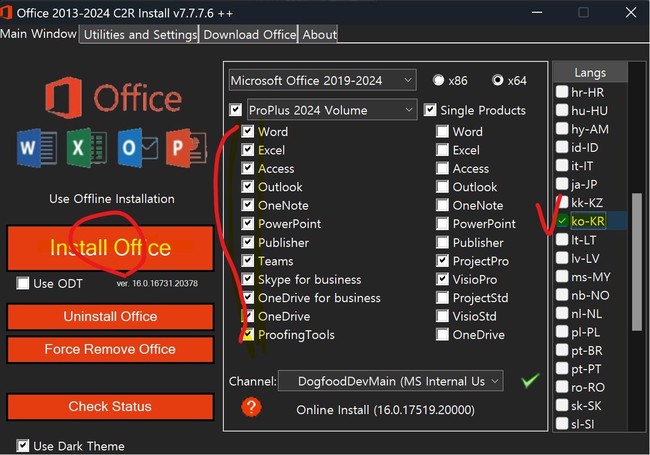 'Langs' 도 ko-KR 을 누르고, 'Install Office' 를 클릭하시면 다운로드 됩니다!!!
