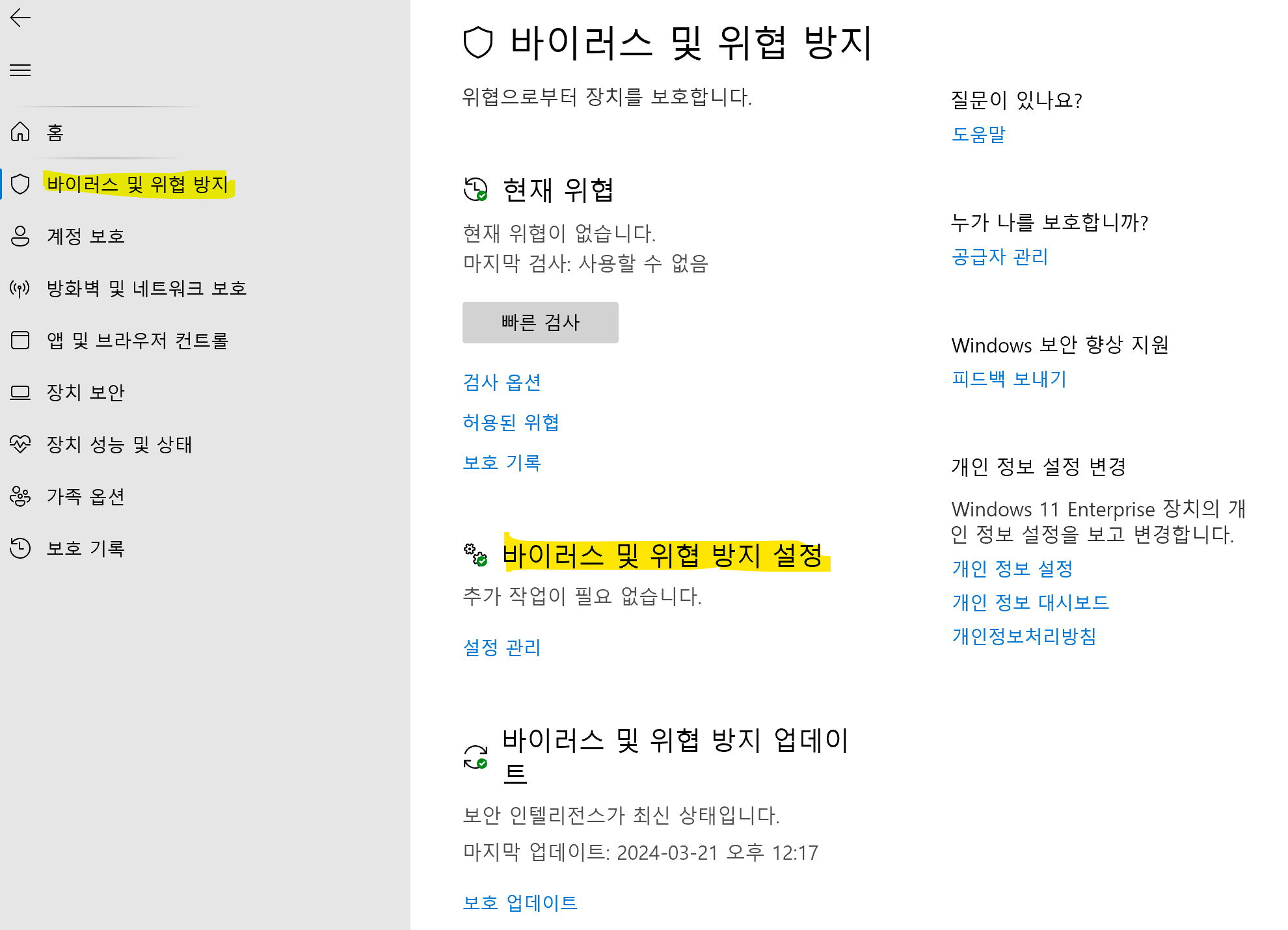 왼쪽 탭에 '바이러스 및 위협 방지'를 클릭하고